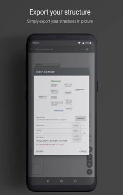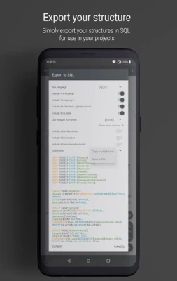 Generovanie validného SQL kódu nebolo nikdy tak priamočiare. Stačí jedno ťuknutie a okamžite získate pripravený skript, ktorý môžete implementovať do vašej databázy, čím výrazne ušetríte čas a minimalizujete chyby. Potrebujete svoje databázové schémy prezentovať alebo zdieľať s tímom či klientmi? Žiadny problém. Intuitívna funkcia exportu vám umožní premeniť vizuálny návrh na obrázok, ktorý môžete jednoducho odoslať a zabezpečiť tak jasnú a zrozumiteľnú komunikáciu štruktúr vašich dátových modelov.