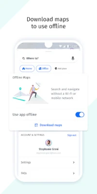 S HERE WeGo si zvolíte spôsob presunu, ktorý vám najlepšie vyhovuje. Potrebujete prejsť na krátku vzdialenosť? Využite presné pešie inštrukcie, ktoré vás bezpečne dovedú k cieľu. Pre rozsiahlejšie presuny si doprajte pohodlie rozsiahlych informácií o verejnej doprave, dostupných vo viac ako 1900 metropolách po celom svete. Pre motoristov je pripravená detailná hlasová navigácia s pokynmi zákrutu za zákrutou, ktorá zabezpečuje bezstarostnú jazdu. A čo parkovanie? HERE WeGo vám inteligentne nájde voľné miesta v blízkosti vašej destinácie a navigáciou vás k nim priamo navedie.