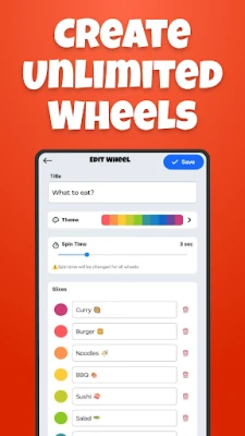 Avšak táto aplikácia ponúka oveľa viac než len náhodu. Objavte pokladnicu možností prispôsobenia, ktoré premenia vaše koleso na dokonalý odraz vašej osobnosti a preferencií. Od živých farieb, cez pútavé štítky, až po unikátne témy – máte absolútnu moc vytvoriť si koleso presne podľa vašich predstáv. Vytvárajte neobmedzené množstvo kolies pre rôzne scenáre, ukladajte si obľúbené nastavenia pre rýchly prístup a zdieľajte výsledky s priateľmi či rodinou.